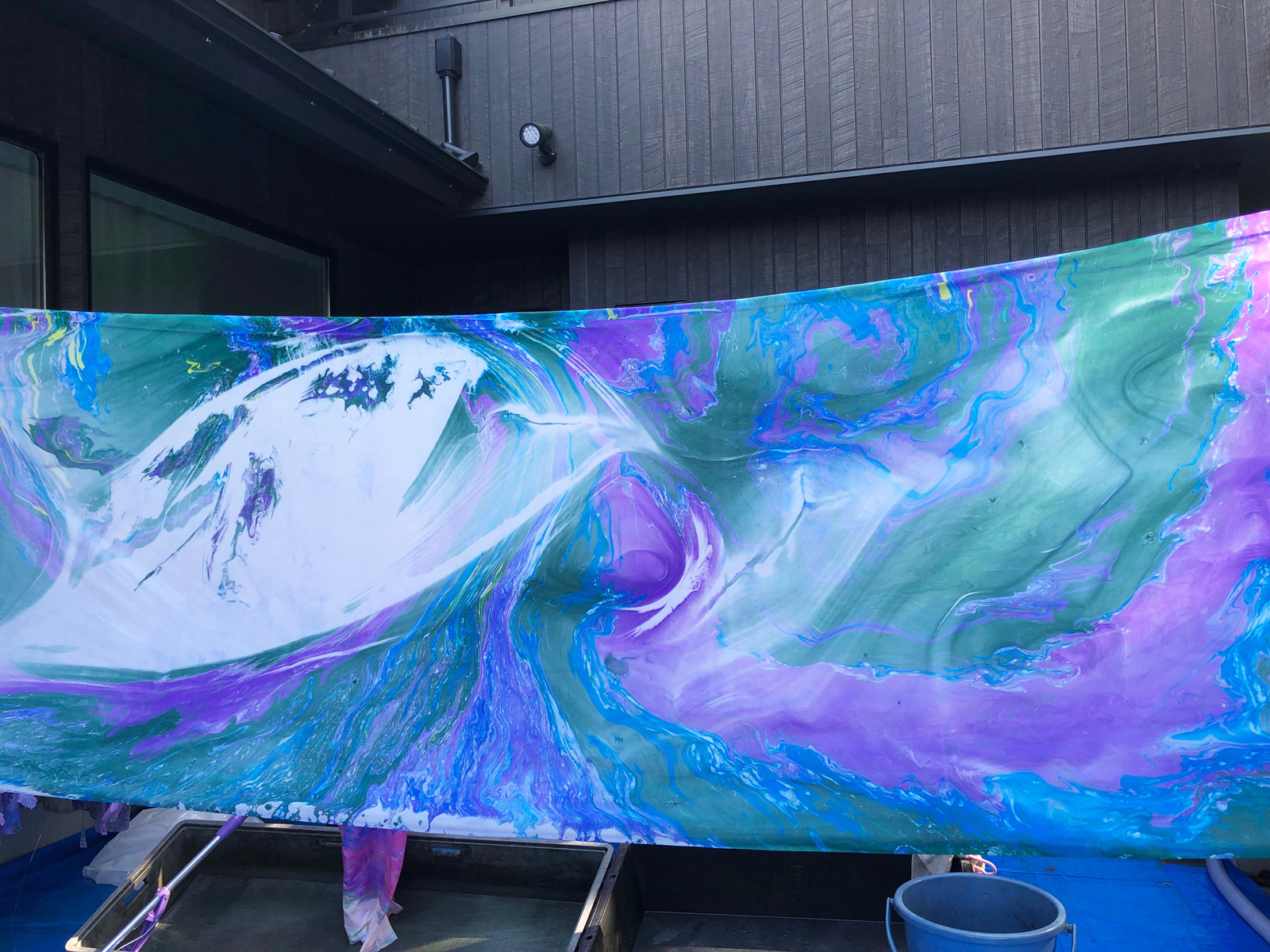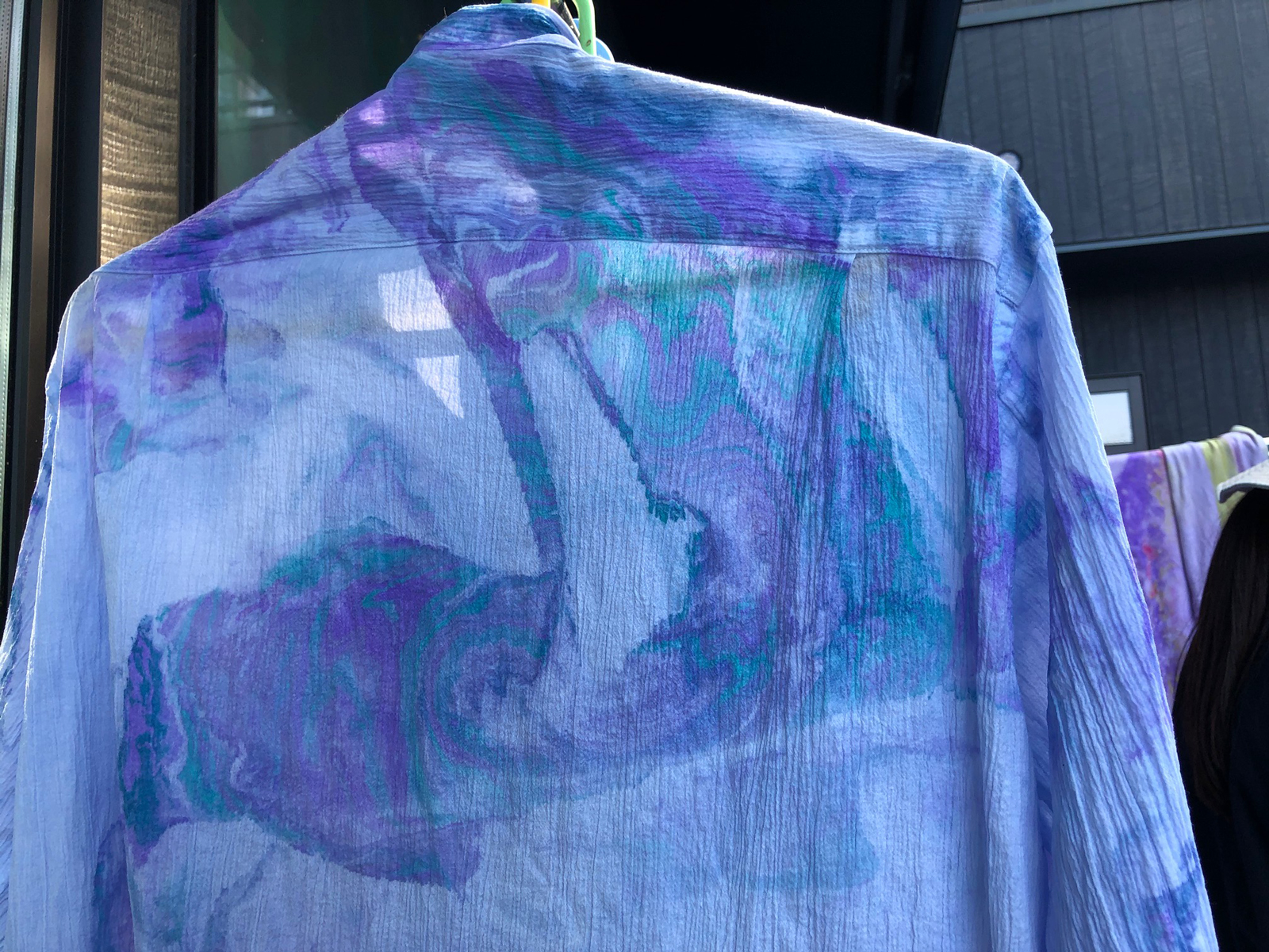 目に見えない世界が見えるように生まれついた私は、目に見えない世界を人にどのように表現したら通じ合えるのかは常に考えることであります。偶然の巡りによりマーブリング染めを始めるようになりました。今は比叡山のお茶室の中庭が制作工房となっています。比叡山の風、光、水、そして私達の生命が交流し偶然写し出される模様は、神々現われ、神と言われた存在現われ、目には見えずとも私達人間が生きる世界に存在する全ての存在が写し出されます。現われ出た模様を皆で見ることが出来、目に見えない世界を皆でわかり合えることが出来、とてもうれしいです。今日も大変ドラマチックな模様が誕生し続け、楽しく喜び合い、気づいたらあっと言う間に終わっていました。時間も暑さも忘れ、無我夢中で出来る事はとても幸せです。いだき講座を受け運命解放され、真の自分を実現出来るドラマチックな人生を生きてゆけることは希望と感じます。世界へ向かい動いていく事を心に抱き、コロナウィルス感染の状況が変わり自由に行き来が出来るようになったら世界に向かっていこうと考えています。ありがとうございます。