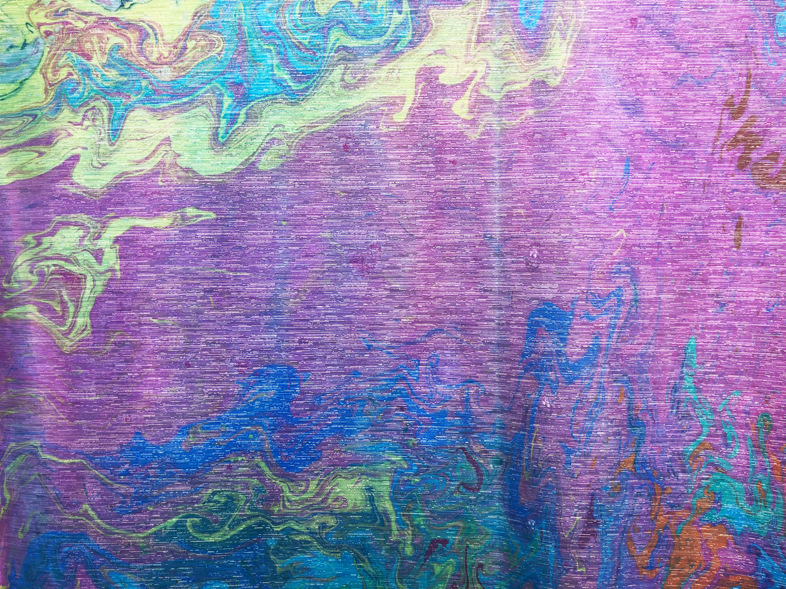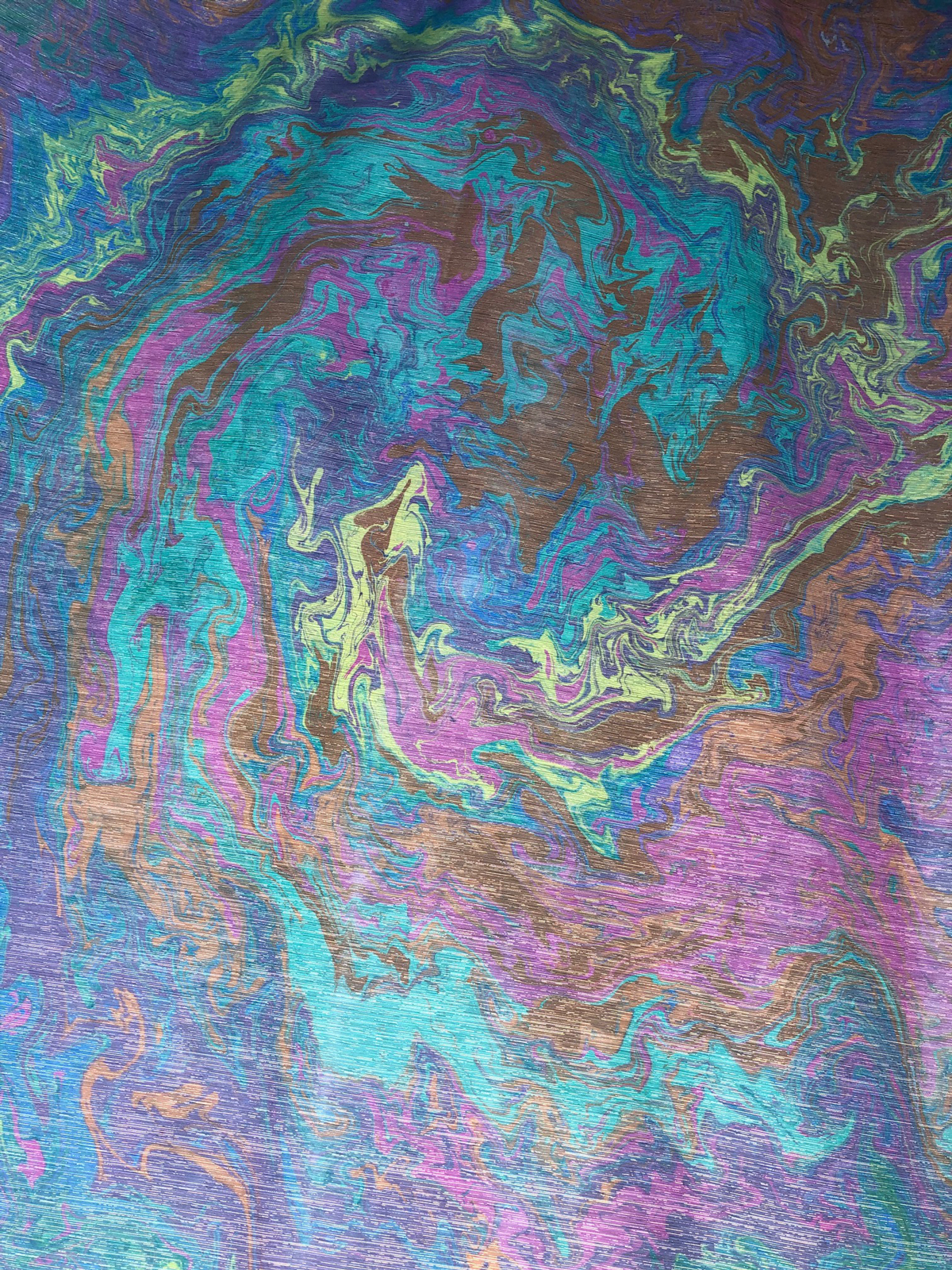 晩秋の陽の光。落ち葉が舞い、地に落ちる音とひとつに水と風、生命ひとつに絵の具をたらし、布をおき。。。写し出される模様は空にあらわる龍とひとつです。自然の生命とひとつになり染めるひと時の豊かさ、楽しいことは、生きる喜びです。今日も比叡山のお茶室の中庭にて素晴らしマーブリング染めができました。とてもうれしいです。空間も季節も時も変わったことを写し出される模様からも感じることができ、とても楽しいです。身に受ける苦しみは生きていることの辛さを感じますが、いだきしん先生の「死について」の講座にて一気に引き上げられ、飛翔し苦痛は一遍になくなり、体中が熱くなりました。