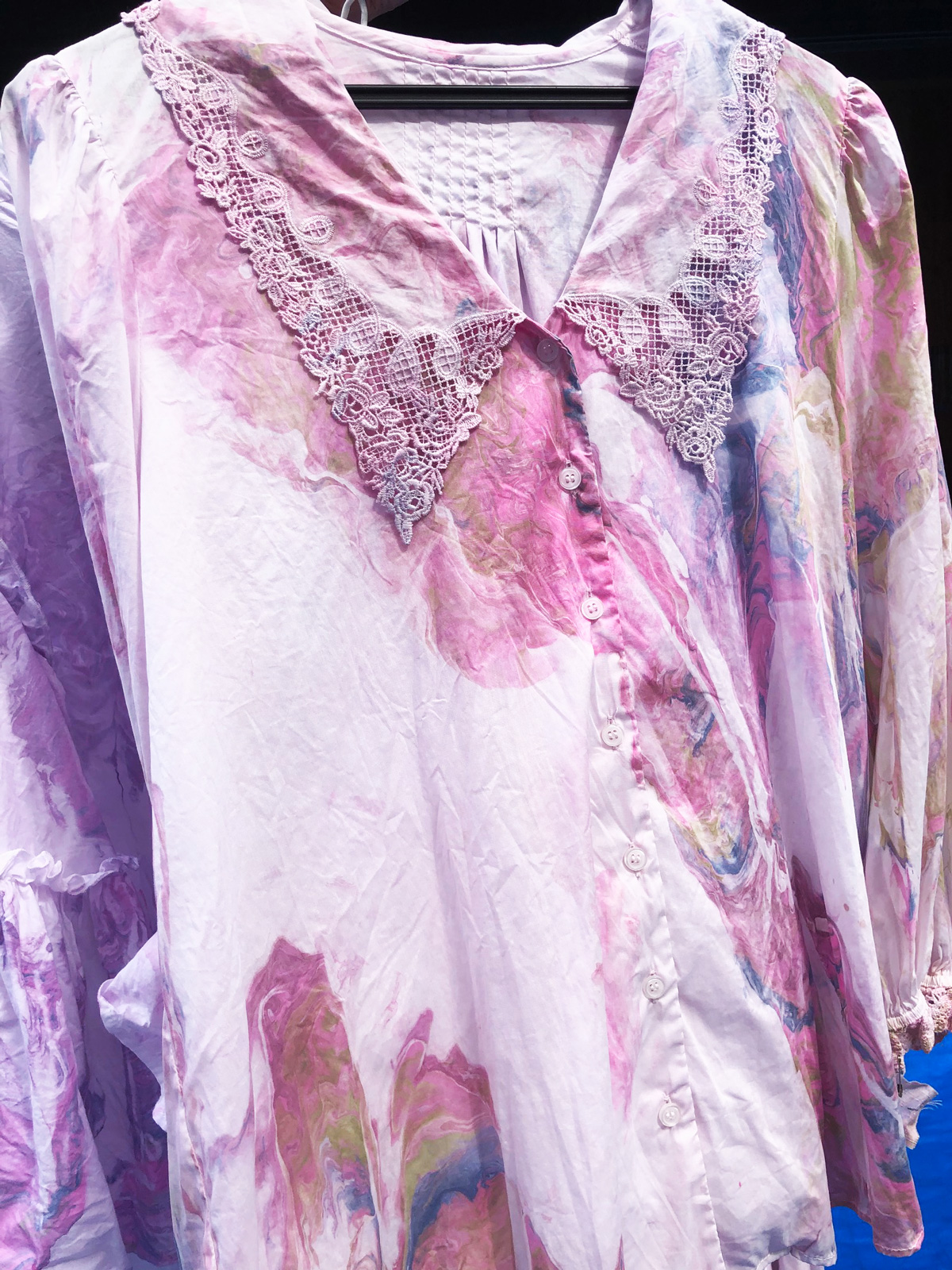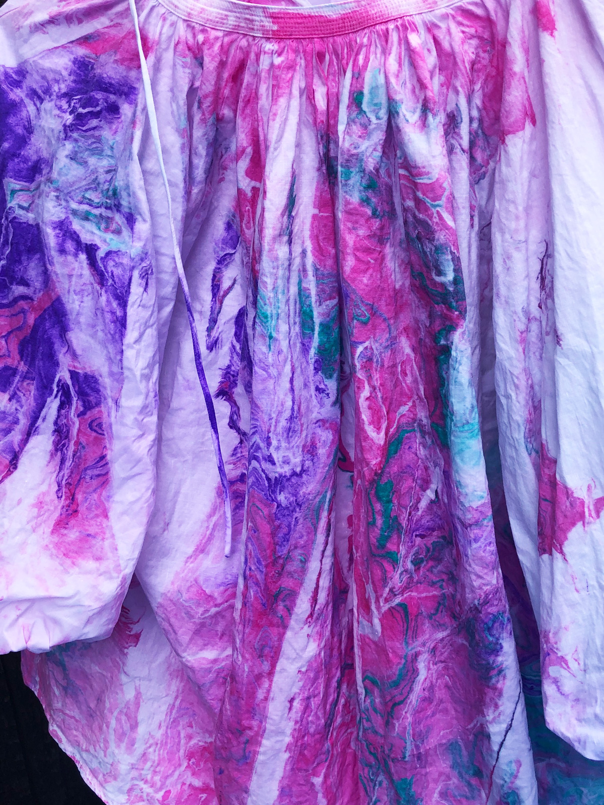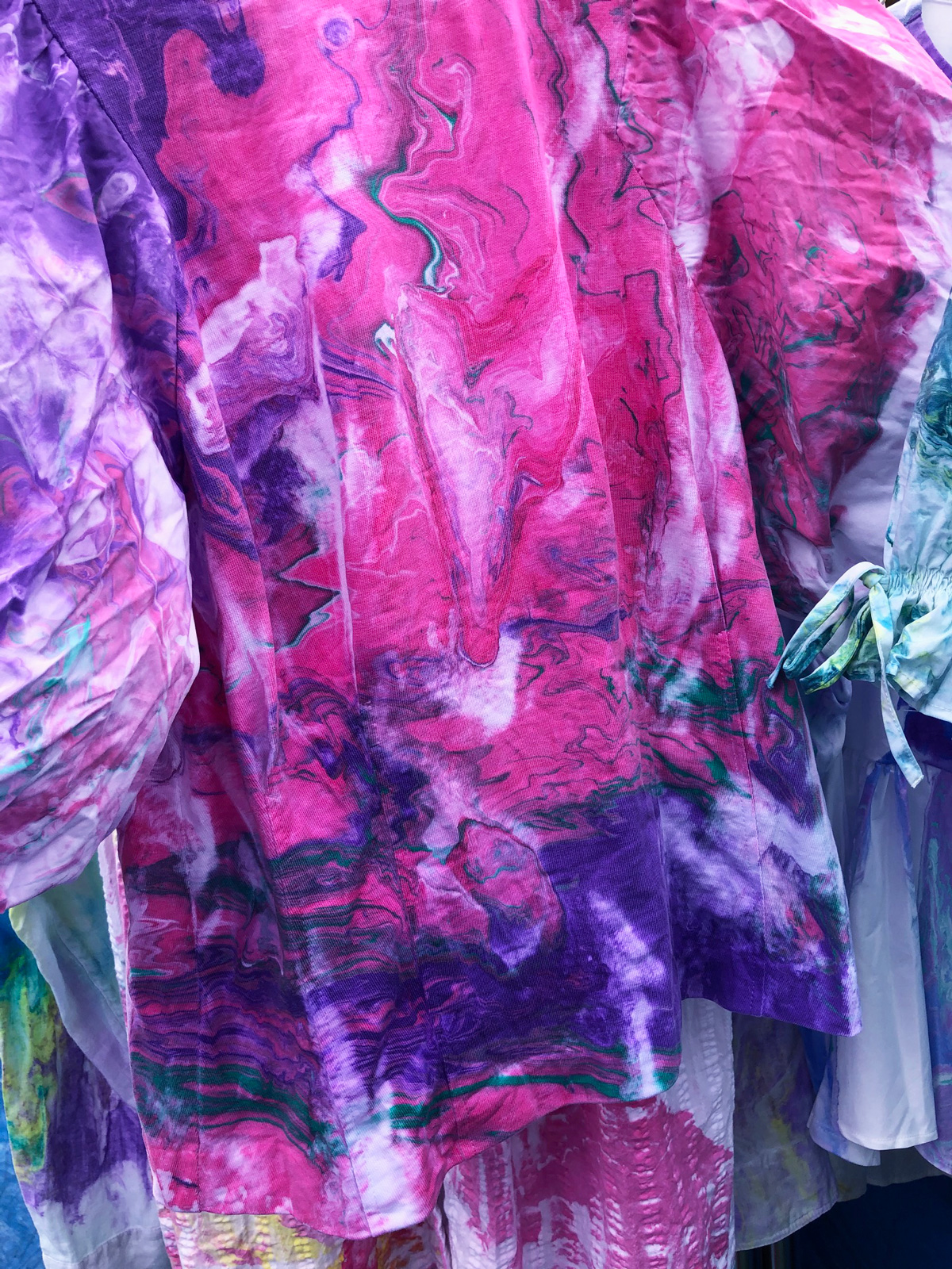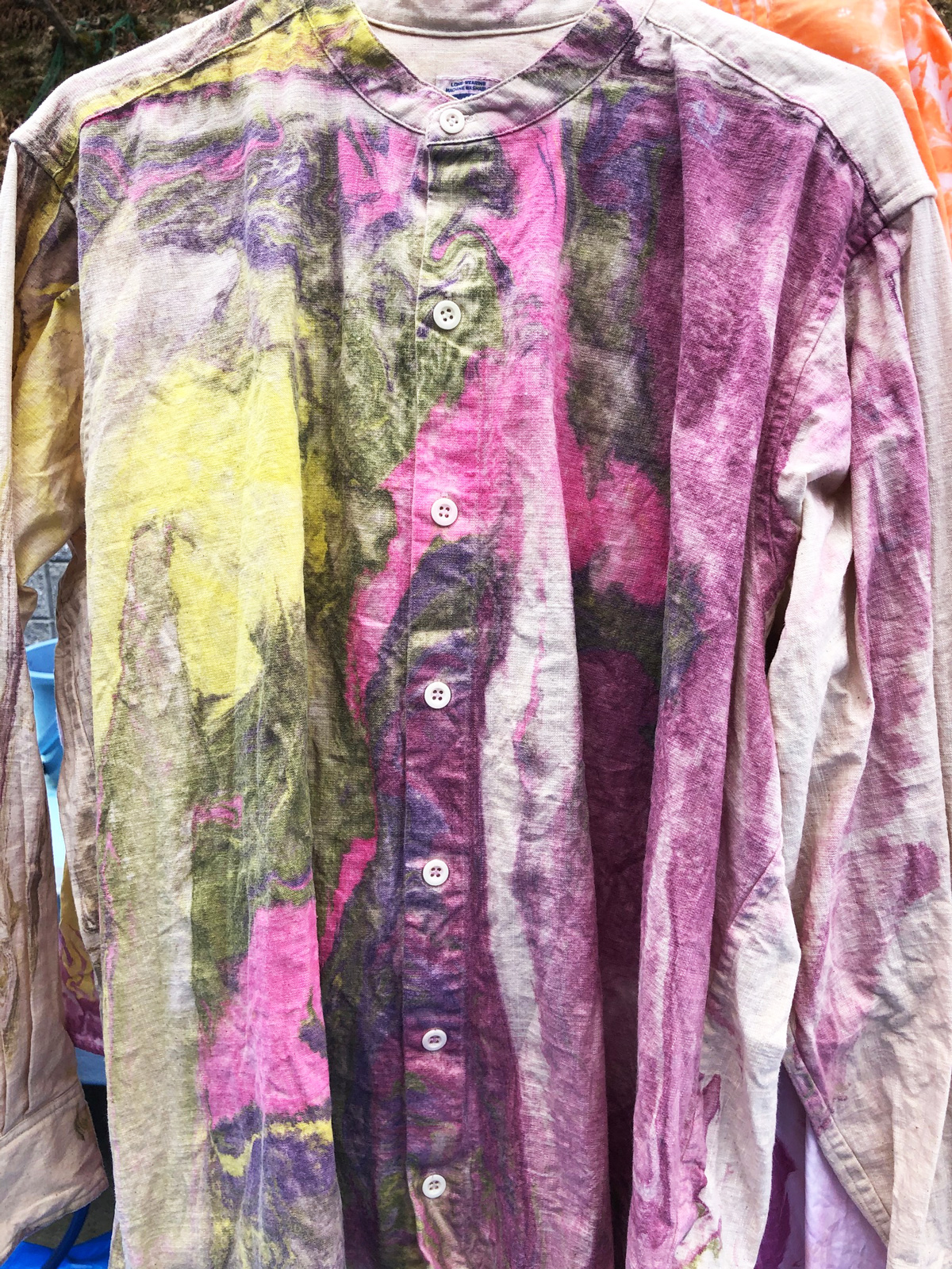 比叡山の斜面にあるお茶室の中庭にあるマーブリング制作場に着くと、うぐいすの鳴き声が天高らかに美しく響いています。ご挨拶していただいたと受け止め、心でお答えさせていただくと、鳥と一体となる喜びが生まれます。風が吹くと、桜のはなびらが舞い落ちてくるのです。空間に咲く花のように優美な舞を見せてくれる美しい姿に感動します。美しい空間にて新しい衣類のマーブリングをすると、それはそれは艶やかにドラマチックな模様が生まれます。自然の生命、空間、目には見えなくても、存在する全てがひとつであることを実感できる瞬間です。内面を表すマーブリングの衣類を身につけ、元気に明るく楽しく生きることは悪魔もよりつくことはないとはっきりと見え、喜び生まれます。これからはおおいなる存在の意を受け、実行できる人間となります。日々訓練していきます。人類全体が生き延びていける道を作ることなくしては生き延びていけないことは身にしみわかります。其の道を作ることはおおいなる存在の意をわかり、表し、動いていくことと考えます。古代、天意を受け、国創りをした先祖の魂が教えてくれます。共に動いていけますことは喜びです。世界で一枚のマーブリング衣類を身にまとい、自由な表現が生まれ、新しい世界を作っていきたいです。皆様にも是非お召しいただければ幸いです。ありがとうございます。