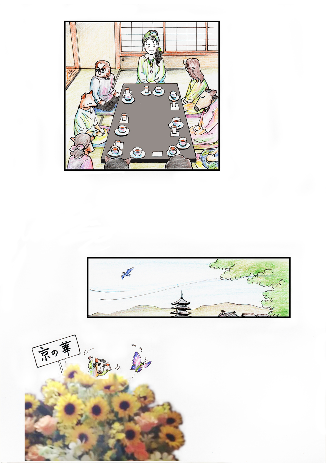 お披露目式は始まりました。尻尾を隠し、鳴き声を抑え行儀よく皆座布団の上に座っています。昔懐かしい香りのする「変態の間」では、女王様の子供の頃の事を尋ねる鳥か牛かわからない変態の表現から、皆が幼き頃の光景を思い出し、魂のルーツを辿るような語らいとなりました。種は違えども魂の声は通じ合えます。様々な種が集い魂の語らいが出来る場は、良き場です。女王様の詩が魂の詩なので、集う一匹、一頭、一羽は、魂を表すことが出来ます。幼い頃の香り、風が蘇り、更に遠い昔、先祖が生きていた光景が蘇り魂の道が見える場であります。