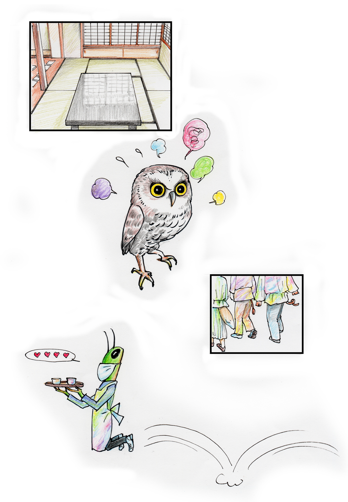 いよいよ「変態の間」に入ると、古式ゆかしい日本間に詩書がたくさん展示されています。変態家族のお父様がお母様の為に作られたお茶室がある日本間です。古の墨の香りがする遠い昔の光景を思い出す日本間です。心静かに墨の香りを辿っていると、どこからともなくフクロウがやってきました。フクロウはよく酔っ払いと間違えられます。この時もたくんさんの魂揺さぶられる詩書を見、酔っ払ったように騒いでいます。牛、豚、狐、妖怪、何者かわからぬ動物がぞくぞくとやってきました。皆、古式ゆかしい日本間では静かにふるまおうとしていましたが、尻尾を出してしまい、おちつかない様子でした。そこに、突拍子もない声を出し、バッタのような変態がコーヒーを運んできました。「本日はどうぞ宜しくお願いします」と言うバッタの言葉は誰も聞き取れませんでした。