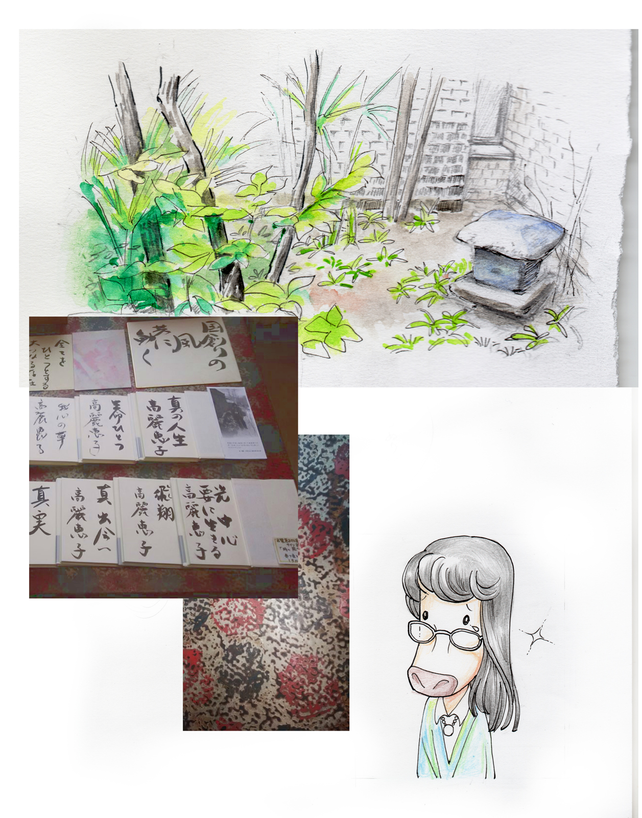 お家の中に上がらせて戴き、廊下を歩いているとガラス越しに美しい中庭が見えました。雨に濡れる木の葉が、こんにちはと言って微笑んでいます。何気ない風景は日本の美を表しています。「変態の間」の前室には、たくさんの詩書が並んでいます。全てに「高麗恵子」というサインが入っています。よく見ると「時の威力」のサイン本が並んでいました。本の隙間に見える美しい模様に目が留まり女王様は、「何ですか」と尋ねると、眼鏡をかけた何者かわからない変態が、お母様が嫁いだ時にお持ちになった津軽塗のテーブルと答えました。赤、深い蒼のコントラストが見事なまでに美しいのです。女王様は歓声を上げ感動を表していました。何者かわからない、牛のようにも見える眼鏡をかけた変態は声も出せず、涙ぐみました。