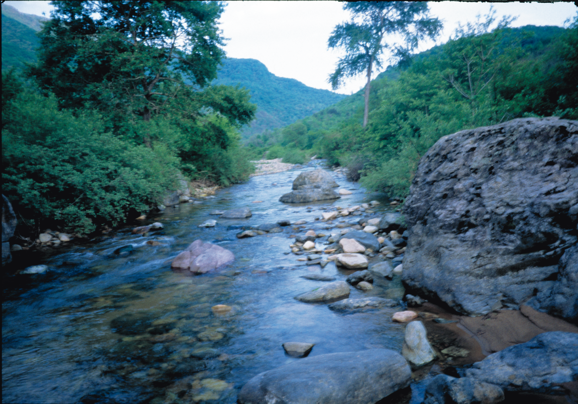 昔の場面が見える川の畔に立つ