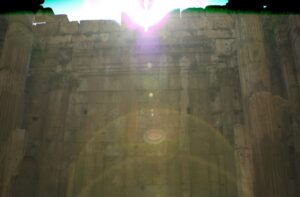 ビブロスのフェニキアの遺跡に行きました。青い海と青い空、何と美しい風景でしょう。古代フェニキア人の魂が光輝き、満面の笑みで迎えてくれています。ピンクの光が輝き、かわいい女の子達が沢山迎えているのだと感じ、自然に微笑みが生まれます。この光景をいだきしん先生が写真を撮られた時に、ピンクの光が写っていました。やはり私が見たピンクの光は、フェニキアの乙女の魂であったのだと分かり、喜び生まれます。その日はバールベックのホテルに宿泊しました。戦争後間もない事は、その空気やホテルの状態でわかりました。ちゃんとした設備はなく、部屋があるだけという状態のホテルでした。朝食の時にトーストとミルクとコーヒーよりなかったので、私は他のホテルでは必ず出されるスクランブルエッグやベーコン等が次に来るのかと待っていましたが、ここではトーストだけだと知らされました。社会状況の厳しさを知りました。それでも、トーストとミルクとコーヒーだけの朝食は、私にとっては何故かうれしく、心がうきうきしていたのです。レバノンでは、何をしても、どの様な状況でも心が浮き立ってくるのです。バールベックにて、バール神が住むという神殿に行きました。ピンクの光、黄色い光、青い光、グリーンの光全て現れ、ひとつになっていました。バール神とは縁があるとずっと感じていました。感じるだけでなく、高句麗の源を調べた時に行き着いた神であったので、様々な書物により調べていたのです。もう、何十年も前になりますが「ひみこ」という作品を作った事があります。見えるがままに言葉に記していったのです。その時に、バール神まで行き着いたのです。高句麗の源にも通ずるバール神が住むバールベックに辿り着けました事は、やはり魂の導きと感じます。