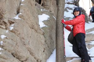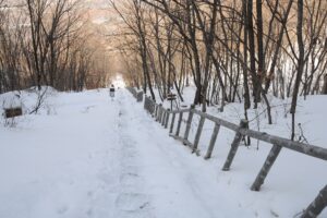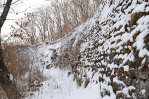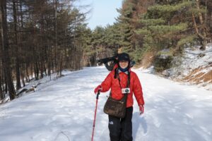 平城跡を発ち、五女山へと向かいました。五女山は雪に覆われていました。いつも見る道は見えず、どこを歩いていいかは分かりません。一面雪景色なのです。ピッケルを持ち、足元を確認し、歩いていくのです。私は雪道であってもどんどん歩けるのでした。真白い道をどこまでも歩いて行きたい気持ちで、どんどん歩いて行くのでした。