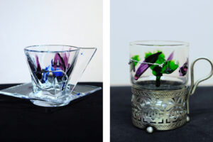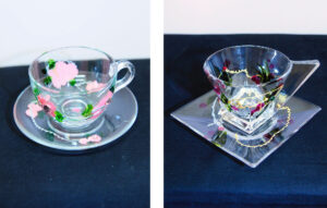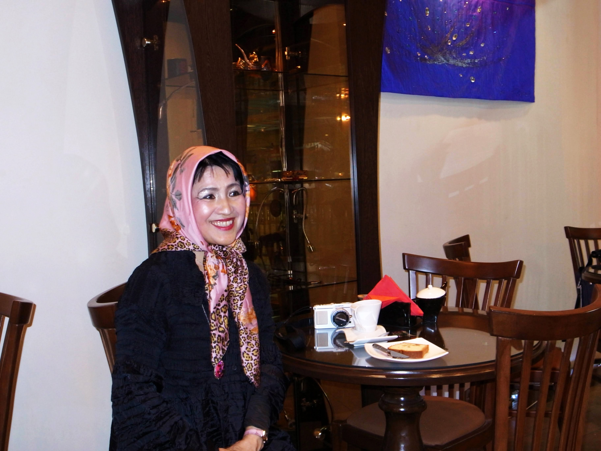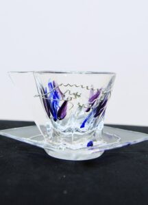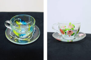 私は、イランでカフェを作りました。そのカフェに置くコーヒーカップやグラスをバフダットホールの楽屋にて制作したのです。イランのNPO高麗スタッフが私の制作があまりに速い事に驚きました。日本に来た時、ラフォーレミュージアム六本木というイベント会場で「高句麗伝説」やいだきしん先生のコンサートを開催した時にロビー一杯に私が作った作品が並べられていると、いつこんなに沢山作るのかといつも聞いていたのです。作っている現場を見た時に、これだけ速ければ、あれだけの作品が作れるものなのだと大笑いしていました。一緒に運ぶ事を手伝っていましたが、運ぶのが間に合わない程速く私は絵を描いていくのでした。大変面白い制作でした。私は、緑と紫の組み合わせが好きです。この組み合わせをコグリョカラーと呼んでいます。高句麗五女山城の石垣の色が緑と紫色だったからです。高句麗色とかコグリョカラーと言いながら、この組み合わせを多く使います。イランでは、コグリョ・ペルシャ編と名付けペルシャンブルーを加え、緑と紫とペルシャンブルーの組み合わせで心模様を描きました。とても美しい色合いです。また、日本からカフェに展示する縮緬生地に心模様を描いたタペストリーも運んできました。タペストリーの心模様を描いている時に、私は「平和の特使」という言葉が生まれました。私の代わりにこのタペストリーがイランのカフェで働いて下さるのだという気持ちになったのです。内面が豊かに、愛に満ちる空間が作られればいいと願いながら描いたタペストリーです。また、ペンダントやブローチも沢山作りました。カフェの特別作って頂いたテーブルは、アクセサリーを入れるガラスケースがついていましたので、お客様はコーヒーを飲みながら心模様のペンダントやブローチを見る事が出来るのです。イランのカフェは「RAZE RAY」という名前です。サンクトペテルブルグでいだきしん先生がつけて下さったのです。そして、サンクトペテルブルグのエルミタージュ美術館で見たテーブルや椅子のイメージを話してイラン人の建築家が作ってくれたテーブルと椅子が置いてあります。とても素敵なカフェになりました。最後に心模様のカップもグラスも出来上がり、ほっと致しました。これからどの様な方がこのカフェにお越し下さり、内面と出会ってゆかれるのかと考えると、とても心がときめくのでした。「RAZE RAY」でのひと時はとても楽しく、幸せなひと時でした。