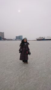 本命と感じた、前ウラジオストク市長さんはそれ以上話は進まずに、その場はお暇する事になりました。ウラジオストクでお会いした方々とカフェの候補地を探し歩きました。また、同胞と名乗り出た方に、極東連邦大学に連れて行って頂きました。その方はそこで絵を教えていらっしゃいました。ご自身も絵をかかれ個展を開いていらっしゃいました。その方のお陰で極東連邦大学に入る事が出来たのです。吹き抜けのガラスには、凍った海が全面に広がっていました。私はここにカフェを作れたらいいと願いました。世界中の優秀な学生がこの大学に来る事をロシア政府は推奨していると聞きました。優秀な学生がいだきしん先生の音を聴いたアンドロメダエチオピアコーヒーを召し上がれば覚醒するのではと見えたのです。私の本音は「子供達が生きられる社会を創りたい」事です。次世代の為にこの人生を賭けていけるのなら本望と氷の海を見てここに人生賭けるという気持ちが生まれたのです。具体的にここにカフェを作ろうと考え始めました。町中で見つけたカフェの候補地では共に動いてくれた男性達がスクラムを組んで同胞と叫ぶのでした。出会ったら皆同胞なのだと最後は私も嬉しくて、共に円陣を組み同胞探しと叫んで喜び合いました。凍てつく寒さ、肌が切れる程の寒さの中、氷の海の上を歩き過ごした瞬間瞬間、今までの人生にない経験の連続でした。同胞探しの旅は予想外の展開となり、この後どうなっていくのかと次に期待しウラジオストクを後にしました。