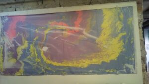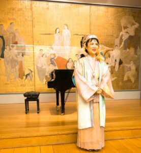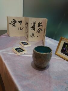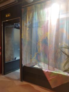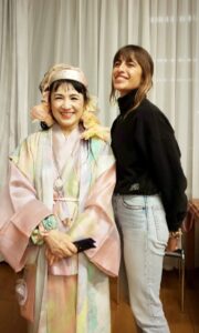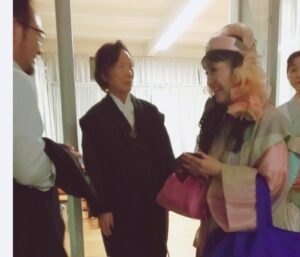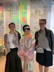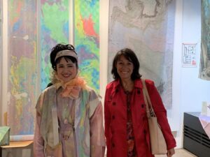 空港には仲間が出迎えてくれていました。先に着いて空港で待っていてくれたのです。そして空港からホテルへと向かいました。先に来ていた仲間とコーヒーでも飲みましょうと隣のホテルのカフェに行きました。コーヒー一杯が一万円という価格であった事には精算の時に驚いたのです。物価高とは聞いていましたが、こんなに高いという事に驚きました。道を歩いていても、私とマーブリングの衣装やヘアースタイルに皆さん「ナイス」とか「ビューティフル」とか声をかけてくれるのです。とても楽しい所と感じます。歩くだけで知らない人に声をかけられ、挨拶し心触れ合う事が出来るのです。そして翌日は作品展の設営をしたのです。設営中に行く人が覗いて行きます。気楽に声をかけると皆さん笑顔を交わして下さるのです。面白い所と感じ、心はとても浮き立ちました。狭いギャラリーに目一杯作品を展示しました。着物の反物はショーウィンドウに掛けました。通りを歩く人が着物の反物をそのまま見れる様に展示した時はとても楽しかったです。