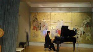 翌日は、いだきしん先生のプレゼンコンサートを開催する予定です。初めて行く場所ですからとても緊張し、心配もしました。少し郊外にあると聞き、タクシーで向かいました。パリの中心部から郊外に抜ける道の風景を楽しみました。そしてプレゼンコンサート会場であるパリ国際大学都市日本館に辿り着きました。先生がコンサートをなさる様な場所ではないと感じながらも手遅れです。ここでやるよりないと気を入れ直し、何とか先生が快適に出来ます様にと準備する事が自分達のやる事と考え、皆でお掃除をしたりし空間を作りました。場所は相応しくなくとも、先生が演奏されたら別世界が立ち現れます。宇宙空間が現われ、又フランスならではの哲学的な事を考える演奏をお聴き出来ました。私は音が図形で見えるので、大変哲学的で数学的な図形が見える音に、パリに来て良かったと心の底から喜びが生まれました。パリでなければこの演奏をお聴きする事は出来なかったと感じます。豊かな文化を生み出していく創造性の源が表現されたと感じ、自分はその源を体で感じる事が出来ました事が大いなる喜びでした。