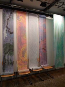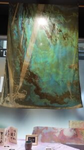 空港には仲間が出迎えてくれていました。先に着いて空港で待っていてくれたのです。そして空港からホテルへと向かいました。先に来ていた仲間とコーヒーでも飲みましょうと隣のホテルのカフェに行きました。コーヒー一杯が一万円という価格であった事には精算の時に驚いたのです。物価高とは聞いていましたが、こんなに高いという事に驚きました。道を歩いていても、私とマーブリングの衣装やヘアースタイルに皆さん「ナイス」とか「ビューティフル」とか声をかけてくれるのです。とても楽しい所と感じます。歩くだけで知らない人に声をかけられ、挨拶し心触れ合う事が出来るのです。そして翌日は作品展の設営をしたのです。設営中に行く人が覗いて行きます。気楽に声をかけると皆さん笑顔を交わして下さるのです。面白い所と感じ、心はとても浮き立ちました。狭いギャラリーに目一杯作品を展示しました。着物の反物はショーウィンドウに掛けました。通りを歩く人が着物の反物をそのまま見れる様に展示した時はとても楽しかったです。