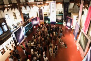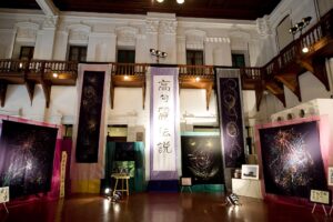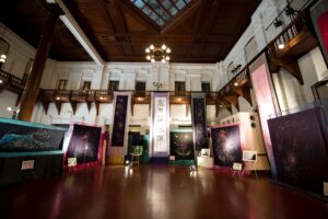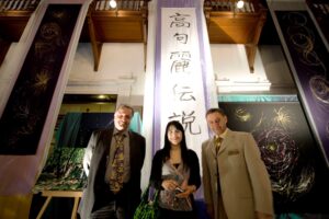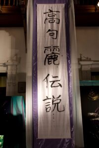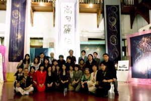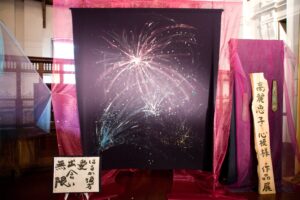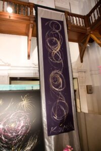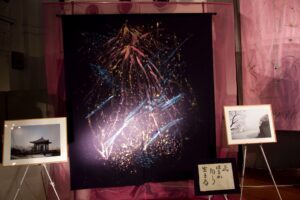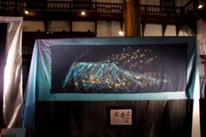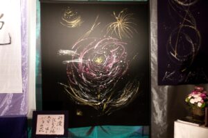 いだきしん先生の車に乗せて頂き向かいました。いだきしん先生は道中「何をするのか」と何度も尋ねました。私は正直な所、何をするかは分からなかったのですが、心模様タペストリーを展示する事だけは分かっていましたので、その様にお答えさせて頂きました。いだきしん先生は何度も「何をするの」と尋ねてこられました。私は、同じ事を答えるばかりでした。京都の会場に着きました。既にボランティアスタッフが大勢お手伝いに来て下さり、皆でタペストリーを展示する準備をしてくれていました。縮緬に描いたタペストリーのカバーとなる生地に糸で作品を縫い付けて下さっていたのです。そして、私が到着すると同時に立ち上げが始まりました。何メートルものタペストリーが1本、2本、3本と立ち上がり、最後は会場を囲む様に立ち上がった時は壮観でした。歓声が上がりました。そして、この会場に入って来た人は皆、歓声を上げ、瞳の色が変わるのです。