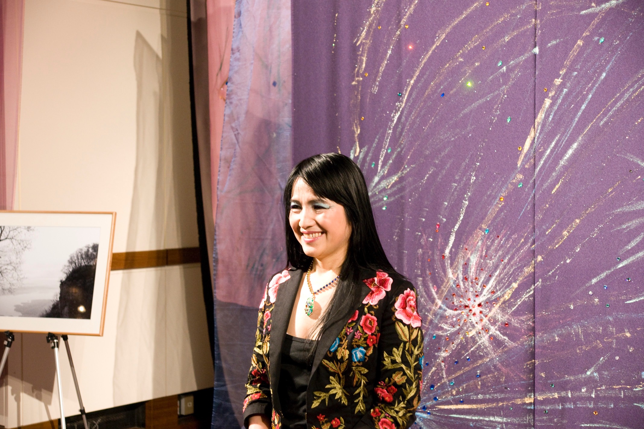 いだきしん先生の車に乗せて頂き向かいました。いだきしん先生は道中「何をするのか」と何度も尋ねました。私は正直な所、何をするかは分からなかったのですが、心模様タペストリーを展示する事だけは分かっていましたので、その様にお答えさせて頂きました。いだきしん先生は何度も「何をするの」と尋ねてこられました。私は、同じ事を答えるばかりでした。京都の会場に着きました。既にボランティアスタッフが大勢お手伝いに来て下さり、皆でタペストリーを展示する準備をしてくれていました。縮緬に描いたタペストリーのカバーとなる生地に糸で作品を縫い付けて下さっていたのです。そして、私が到着すると同時に立ち上げが始まりました。何メートルものタペストリーが1本、2本、3本と立ち上がり、最後は会場を囲む様に立ち上がった時は壮観でした。歓声が上がりました。そして、この会場に入って来た人は皆、歓声を上げ、瞳の色が変わるのです。