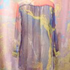 柔らかくシルクのように軽いシフォン生地にマーブリングプリントを施したブラウスです。ボタンを留めてブラウスとしてご着用いただくのはもちろん、ジャケットのようにワンピースの上に羽織っていただいてもエレガントな一着です。