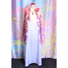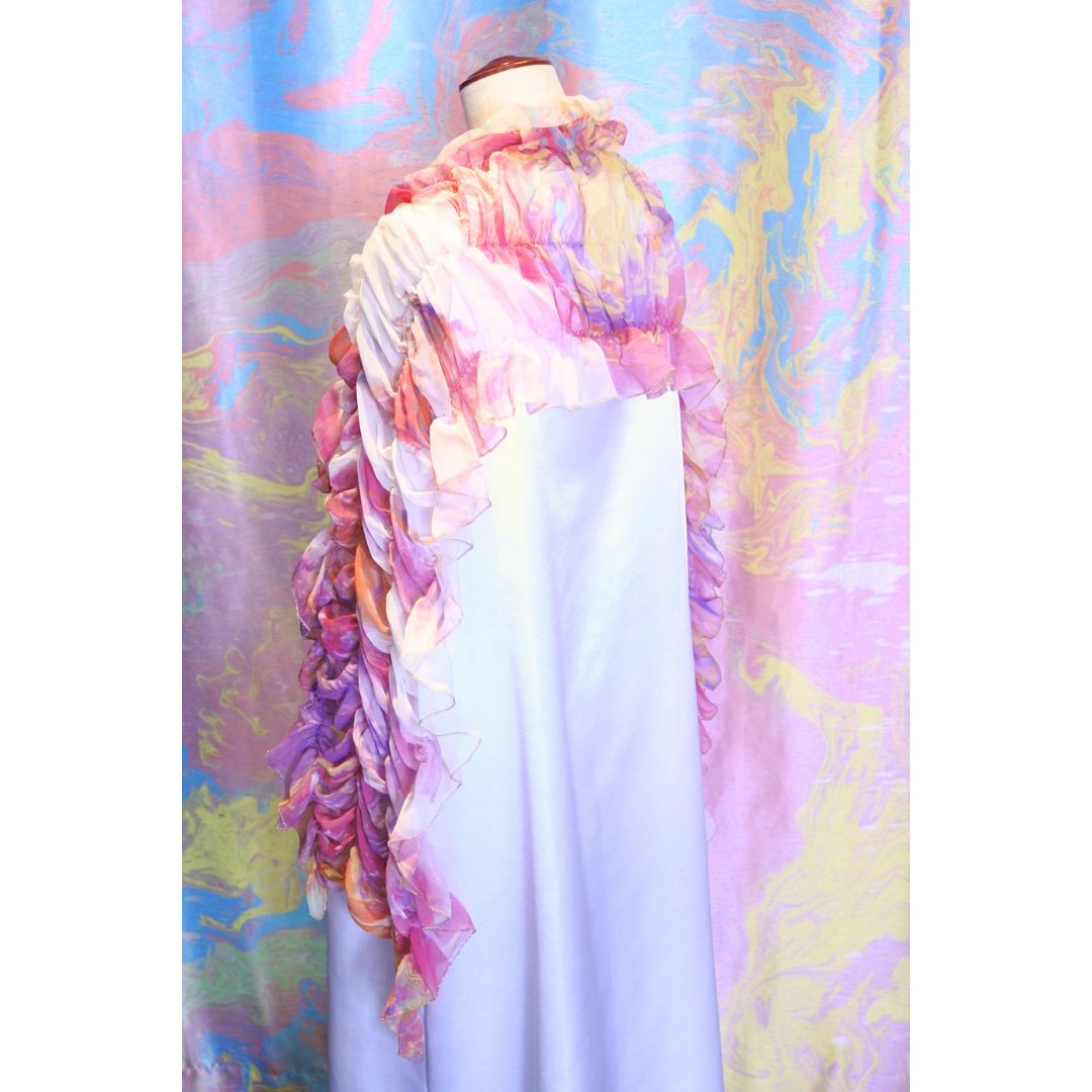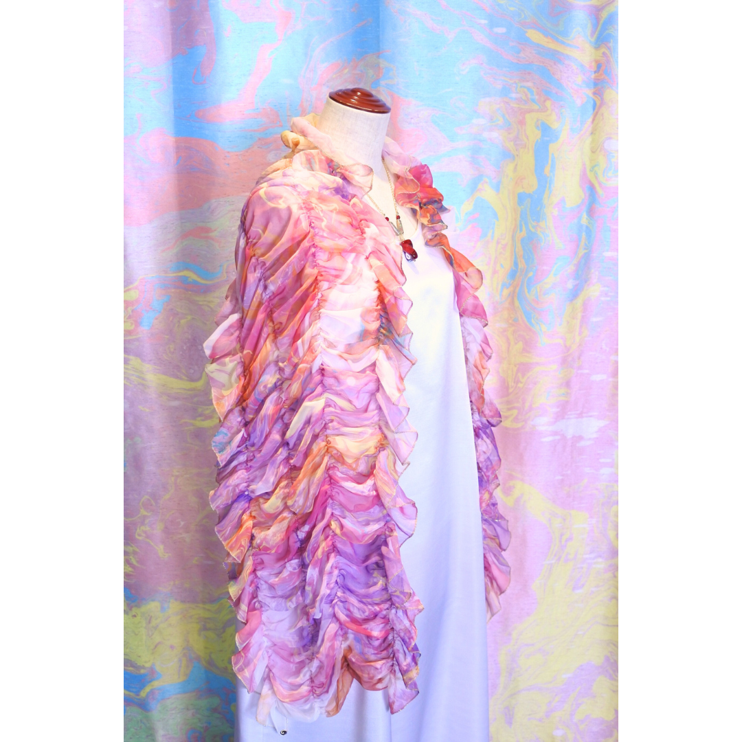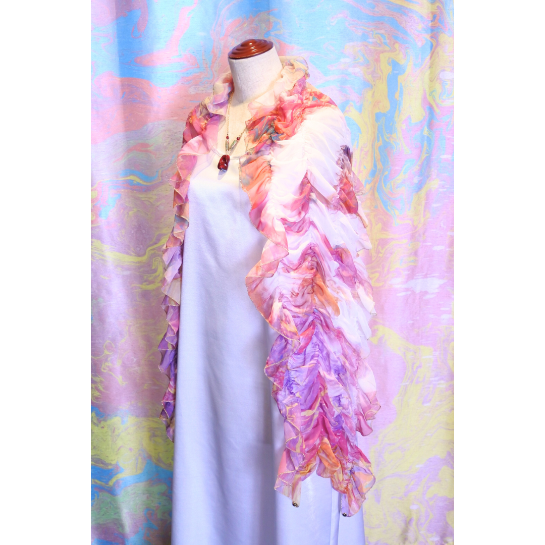 柔らかくシルクのように軽いシフォン生地にマーブリングプリントを施したシャーリングのショールです。さっと羽織るだけでとても華やかな装いになります。
