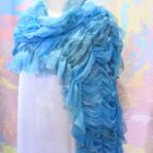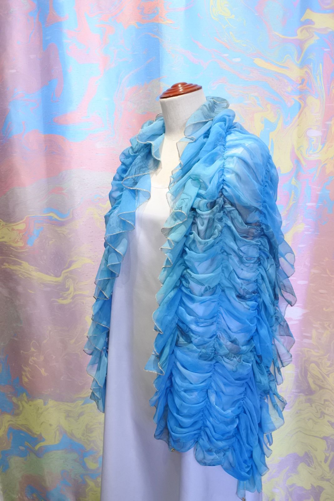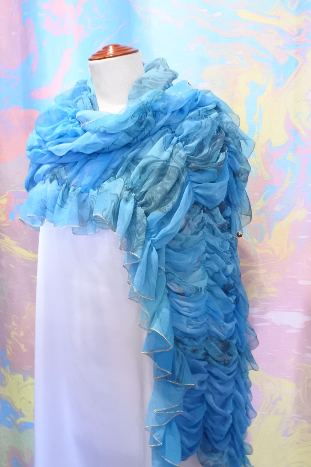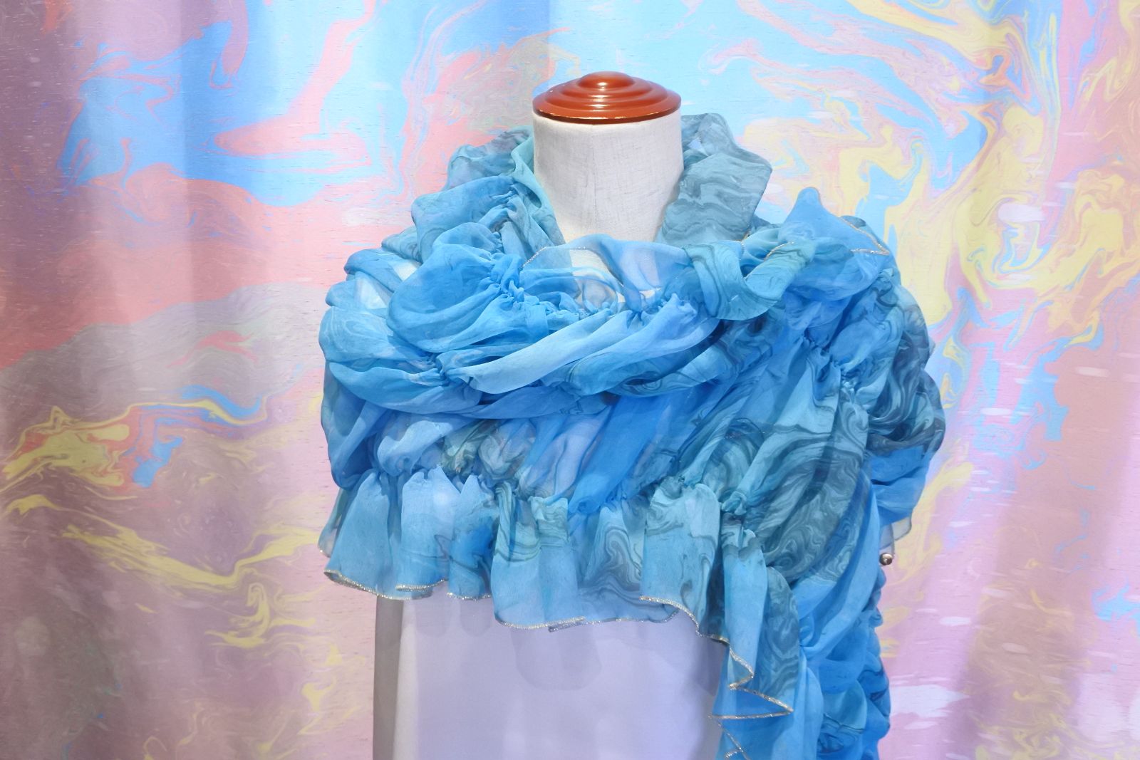 柔らかくシルクのように軽いシフォン生地にマーブリングプリントを施したシャーリングのショールです。さっと羽織るだけでとても華やかな装いになります。