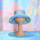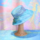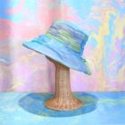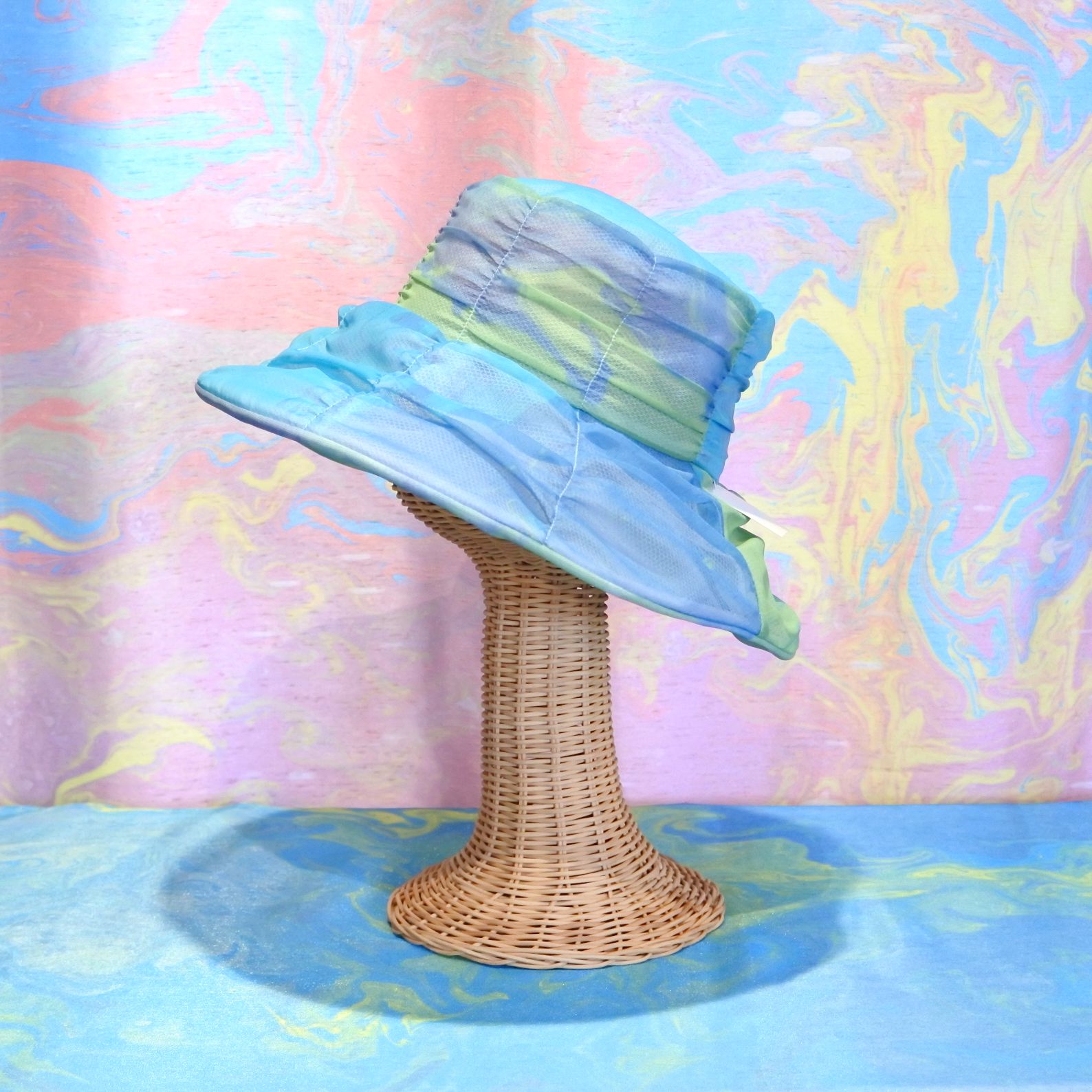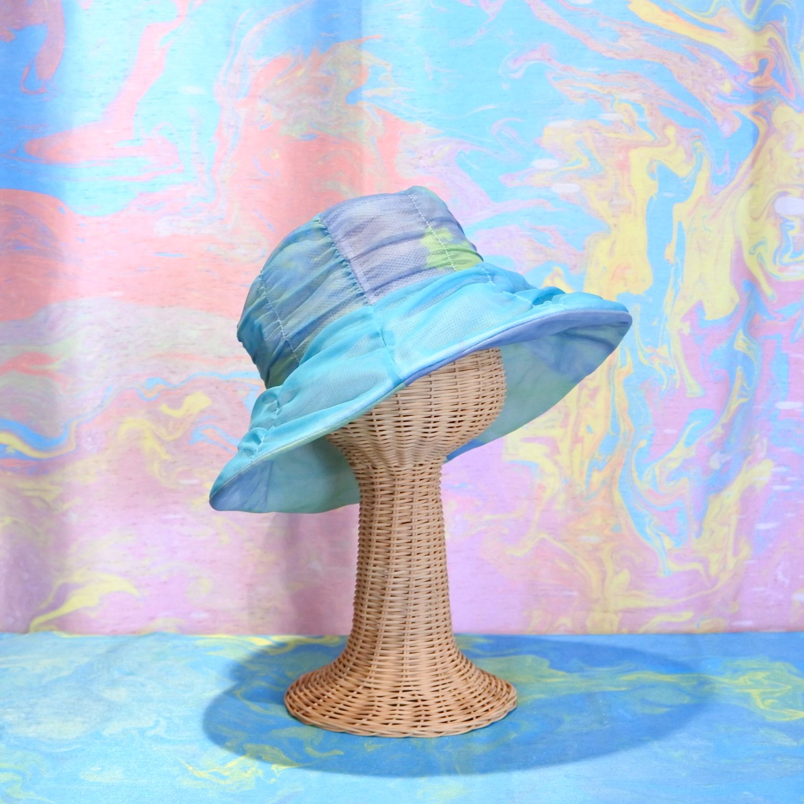 陽の光に映えるとさらに美しいマーブリングのシフォン生地を使ったシャーリングハットは、軽くふんわりとしたエレガントな帽子です。内側のマジックテープでサイズ調節が可能です。