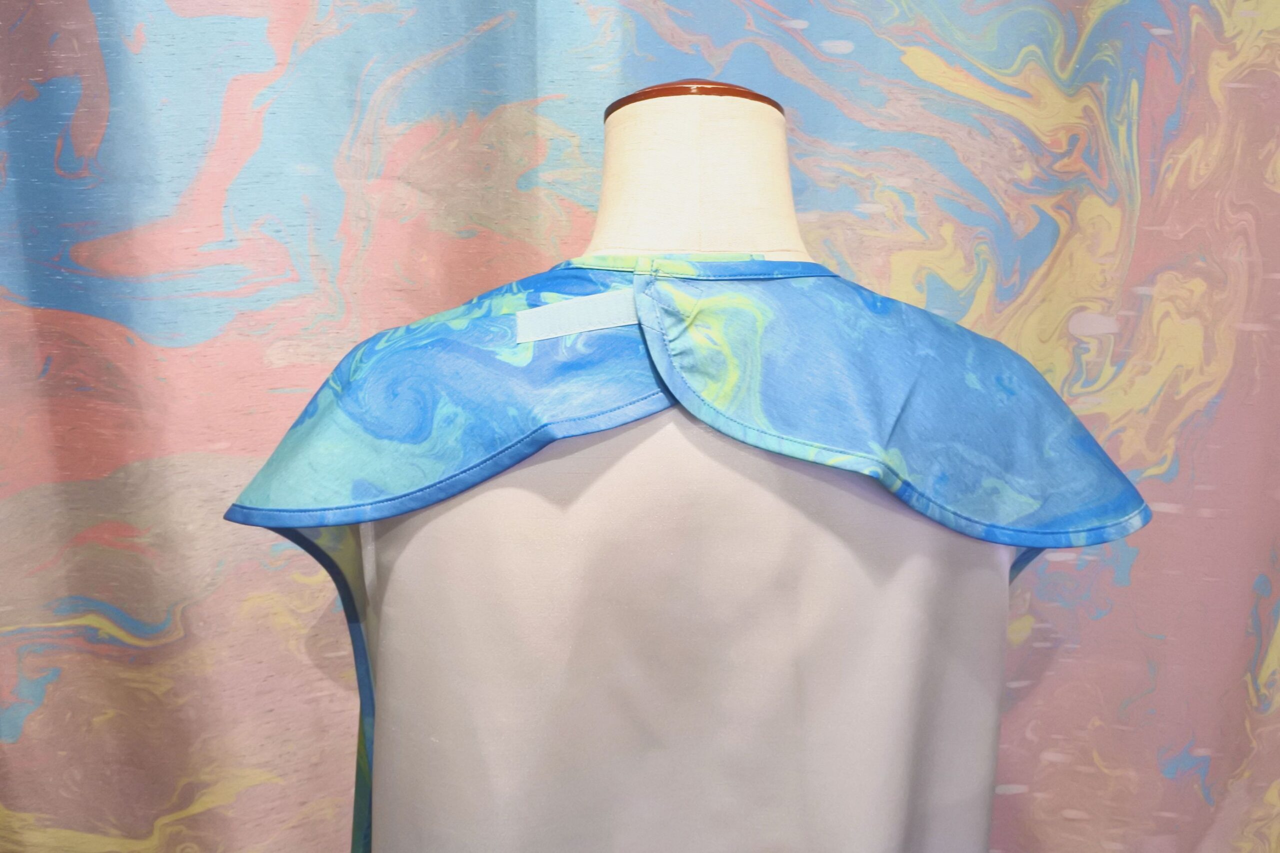 マーブリングのスタイ型エプロンは、お食事の時、工作の時など、様々なシーンでご使用いただけます。お着物や大切なお衣装を着用されている時にも役立ちます。首元はマジックテープで調整可能となっており、男性も女性もお使いいただけます。軽くさらっとした素材なので着心地が良く、たたむとコンパクトになるので持ち運びにも便利です。