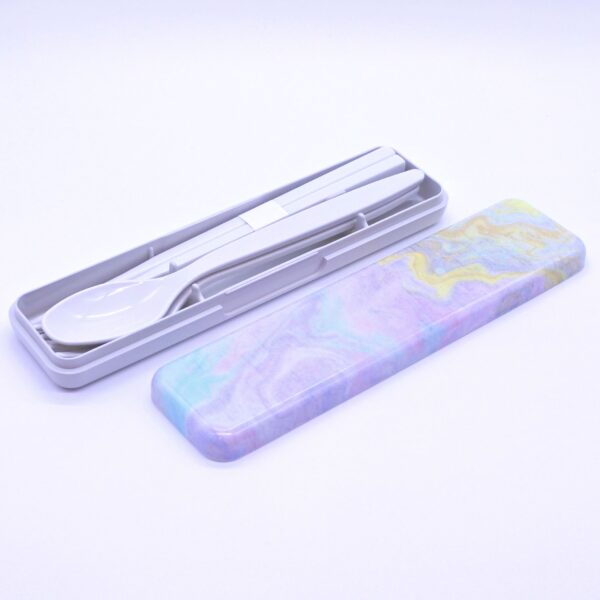 マーブリングプリント生地を使った布貼りケースの中に、お箸、スプーン、フォークの3点セットが入ったトリオセットです。マーブリングお弁当箱と合わせてランチタイムに、また旅のお供にもお勧めです。